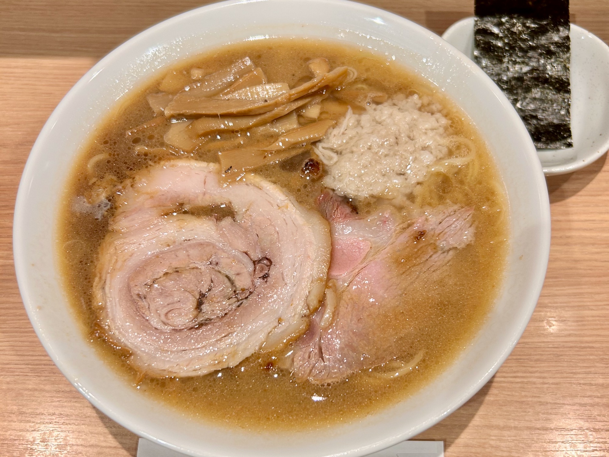 変わり種トッピングがある気がしてスペシャルにしたが味玉とチャーシュー増量(低温調理による豚肩ロース・豚バラ、鶏ムネ)、海苔が付いたのかな。なんとなく見た目も支那そばやテイストを感じられたがスープや麺にもそれらを感じられた。まるで「支那そばやコラボ」かと思うほど。もちろんコラボでもそうでなくても、このラーメンは実においしい。見事にウマい。