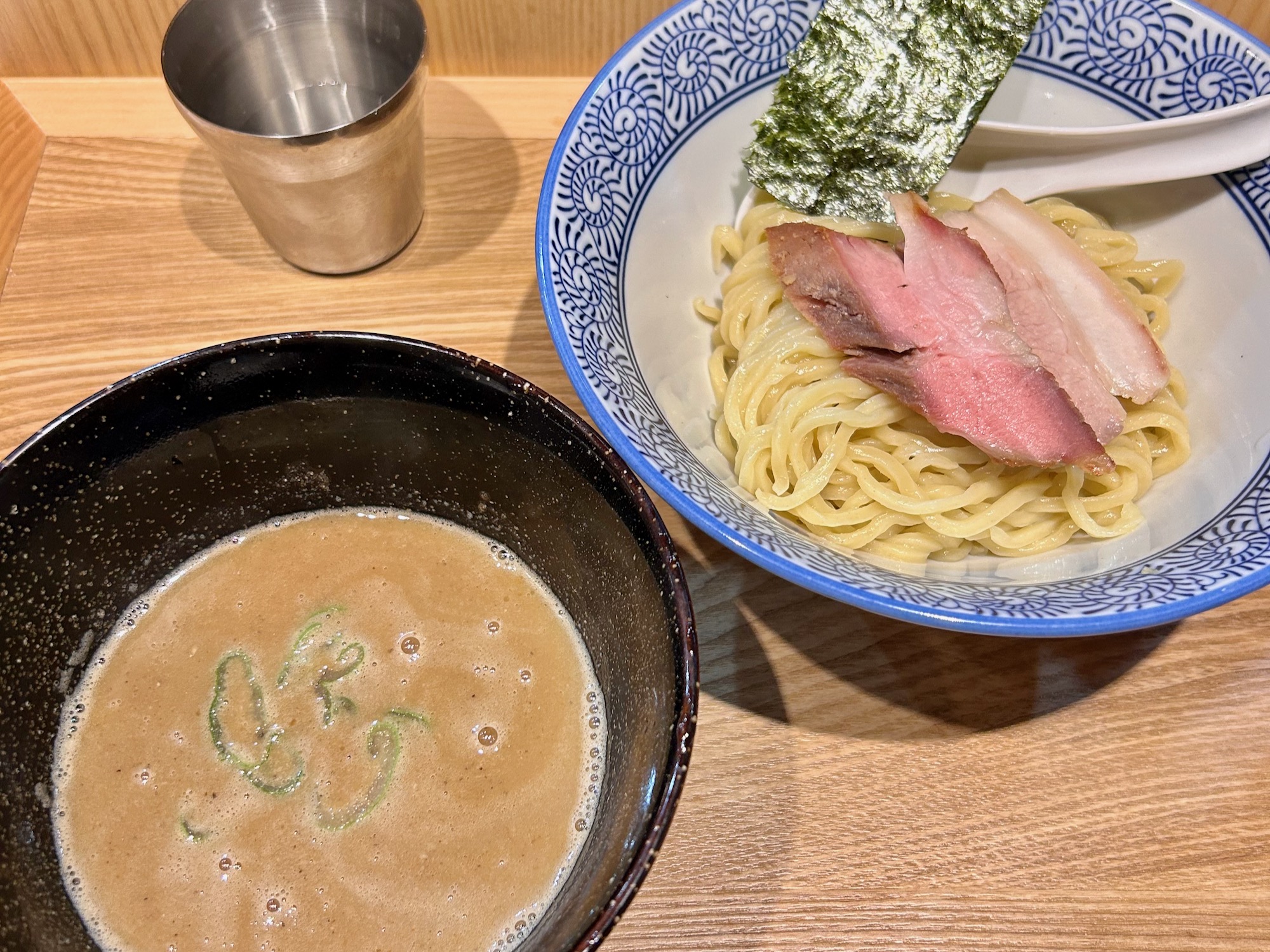 注文ごとに麺帯から切り落とす自家製麺はやや太めの縮れでスゴくおいしい。やはり、最初から何人かがつけ麺を注文。ウリも人気もつけ麺と言っていいだろう。つけ汁は濃厚な豚骨魚介。パッと見、「麺屋一燈」風だが、そちらは動物系(鶏白湯)魚介という点では同じだが、構成が違う。時代は、昆布水つけ麺が隆盛だが、こういうタイプもちゃんと作るとやっぱりおいしい。割スープは卓上にあるポットから。軽く薄めて完飲。おいしかった。機会があればらーめんも食べに来よう。