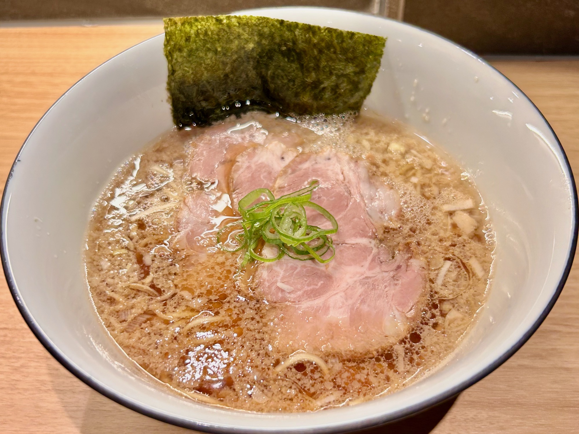 醤油ラーメンはデフォルトでチャーシュー3枚が入っていて嬉しい。他に青ネギ、白ネギ、背脂、海苔。